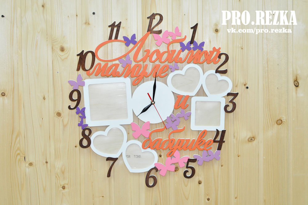 Как здорово, когда изделие не просто красивое, а еще и функциональное! Часы с фоторамками - идеальный вариант подарка для любимой мамули и бабушки! Часовой механизм бесшумный. Надписи, количество и расположение рамок можно изменить по желанию. Перед изготовлением мы присылаем на согласование эскиз изделия в цвете.
