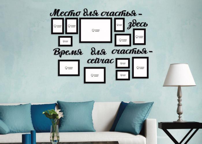 Если в вашем доме есть пустая и скучная стена, то с помощью композиции "Место для счастья здесь" Вы сможете разнообразить и оживить интерьер! Ведь без декоративных элементов очень трудно добиться уюта, комфорта и семейного тепла, которые так необходимы в любом семейном гнездышке! Надписи, количество и расположение рамок можно изменить по желанию. Перед изготовлением мы присылаем на согласование эскиз изделия в цвете.