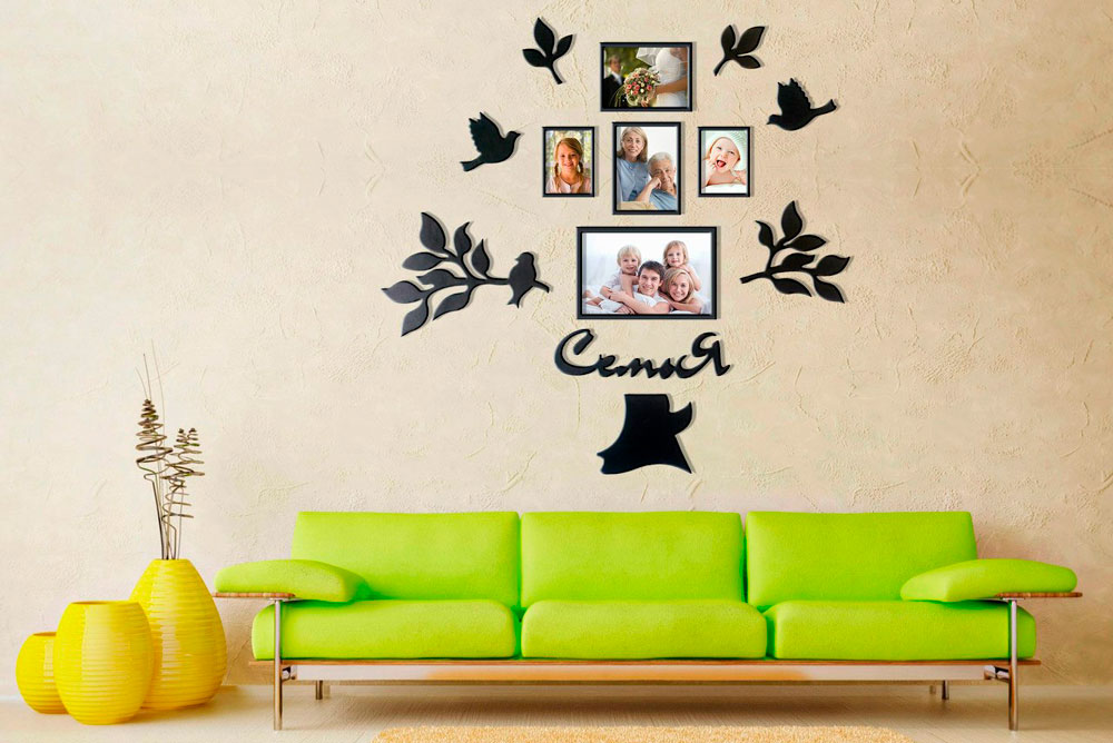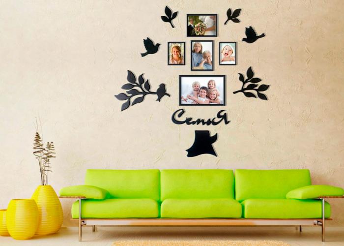 Если в вашем доме есть пустая и скучная стена, то с помощью композиции "Семейное дерево" Вы сможете разнообразить и оживить интерьер! Ведь без декоративных элементов очень трудно добиться уюта, комфорта и семейного тепла, которые так необходимы в любом семейном гнездышке! Надписи, количество и расположение рамок можно изменить по желанию. Перед изготовлением мы присылаем на согласование эскиз изделия в цвете.